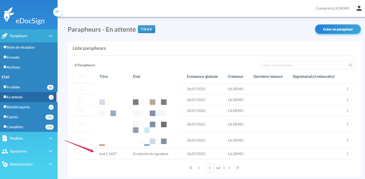 Pour cela, vous devez d'abord rechercher votre parapheur en question. Puis cliquer dessus, pour voir son contenu.