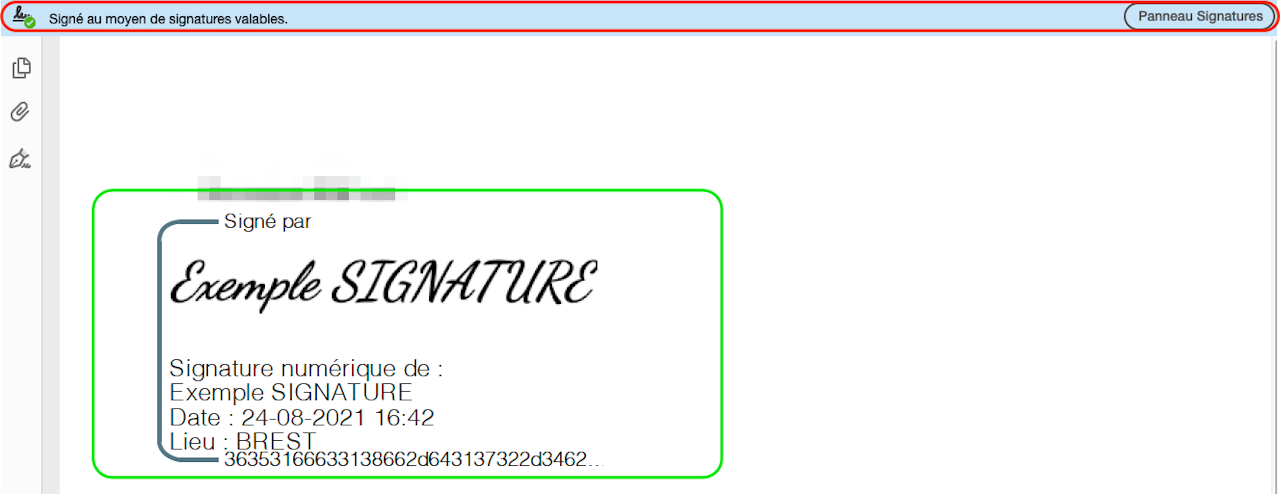 En ouvrant en document signé numériquement avec Adobe Reader PDF, un bouton Panneau Signature s'affiche.