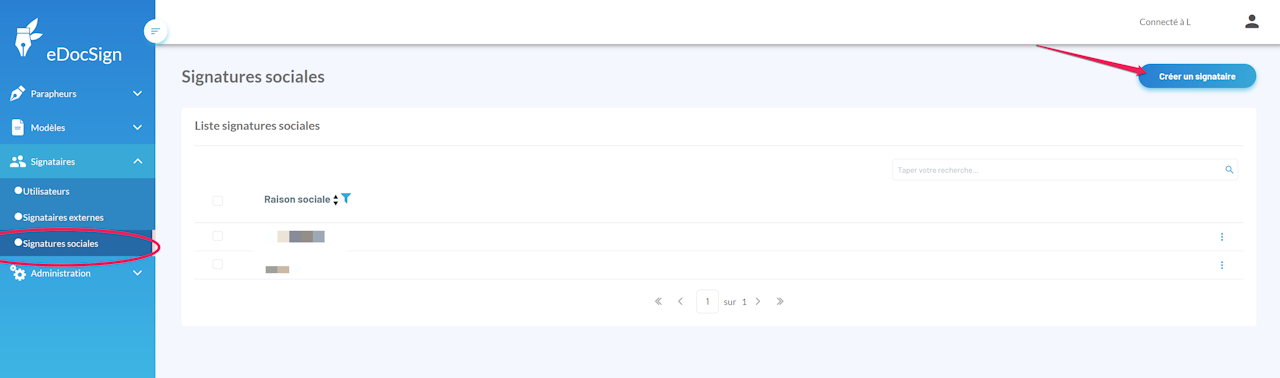 Pour cela, cliquez sur Signataires puis Signatures sociales et enfin Créer un signataire